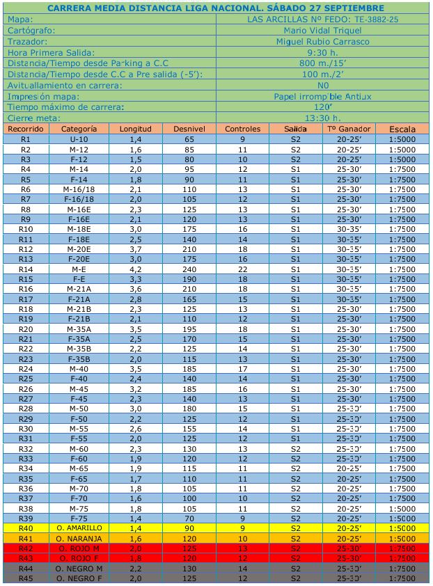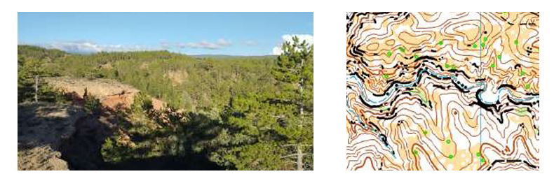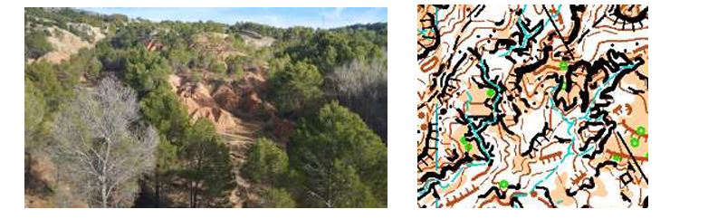 Comentarios del Cartógrafo: Nos encontramos con un terreno de características especiales, que por tal motivo va a requerir de una adaptación cartográfica importante. La existencia de unos suelos arcillosos comunes a toda la zona (dan nombre al paraje) ha hecho que a lo largo del paso del tiempo la acción erosiva del agua de una parte, y la acción extractiva del hombre de otra, se haya configurado un paisaje que a nadie dejará indiferente. Por todo lo cual la profusión de grandes terraplenes impasables que pueden alcanzar los 20 metros será una nota dominante, lo que junto a surcos de erosión de gran profundidad conformarán un espacio donde en el aspecto representativo el color negro de las barreras naturales será la principal característica del mapa. A esto habrá que unirle la existencia de un relieve de desniveles acusados con multitud de detalles topográficos. Para acabar de completar esta singularidad vamos a tener de por medio la existencia de multitud de pequeños senderos ciclables no siempre muy evidentes y que por razones de legibilidad en determinadas zonas se han tenido que omitir. Todo lo anterior nos va a llevar a la ineludible necesidad de realizar unos ajustes en cuanto a los parámetros normativos en simbología y escala de competición que podríamos resumir en: uso del 1/7.500 como escala final del mapa para todas las categorías, y ajuste simbólico a los parámetros de representación a 1/10.000. De no aplicar estos desvíos es totalmente inviable la representación del entorno y es por ello que se ha solicitado al Comité de Cartografía FEDO tal adaptación. En definitiva, se va a correr una prueba de Media Distancia en un terreno espectacular que bien merece las adaptaciones que se le han aplicado. |